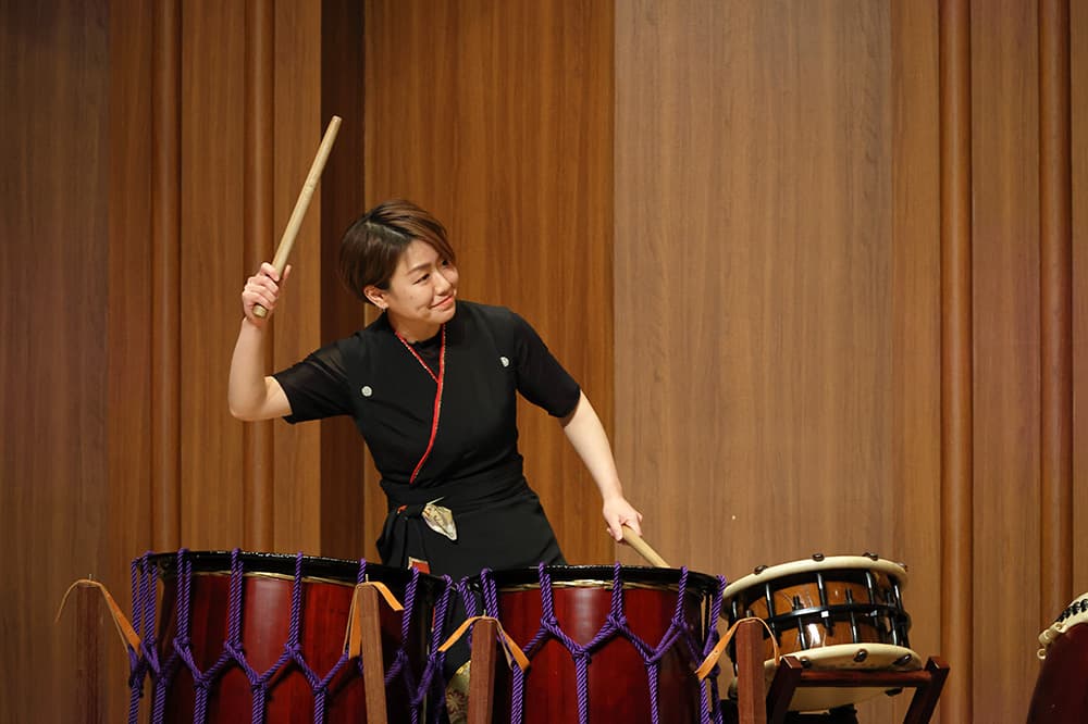 The four members of Wasane, Toshikazu Yamauchi (shamisen, taiko), Satoshi Matsuo (flute), Hidehiro Yura, and Ayaka Okamoto (taiko), formed the group in 2007 and have been performing throughout Japan.The concert featured a variety of taiko drums, shinobue (bamboo flute), and shamisen (three-stringed Japanese banjo), and a variety of original pieces, including arrangements of Japanese folk songs and original compositions that showcased each performer's unique style.The participants clapped their hands and shouted, and had a lot of fun together.In between the pieces, each instrument was introduced, and the international students who were not familiar with Japanese instruments listened with great interest.
